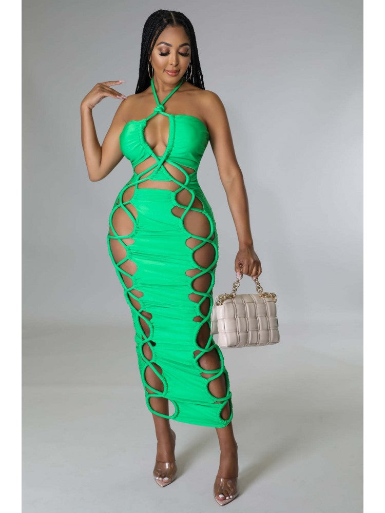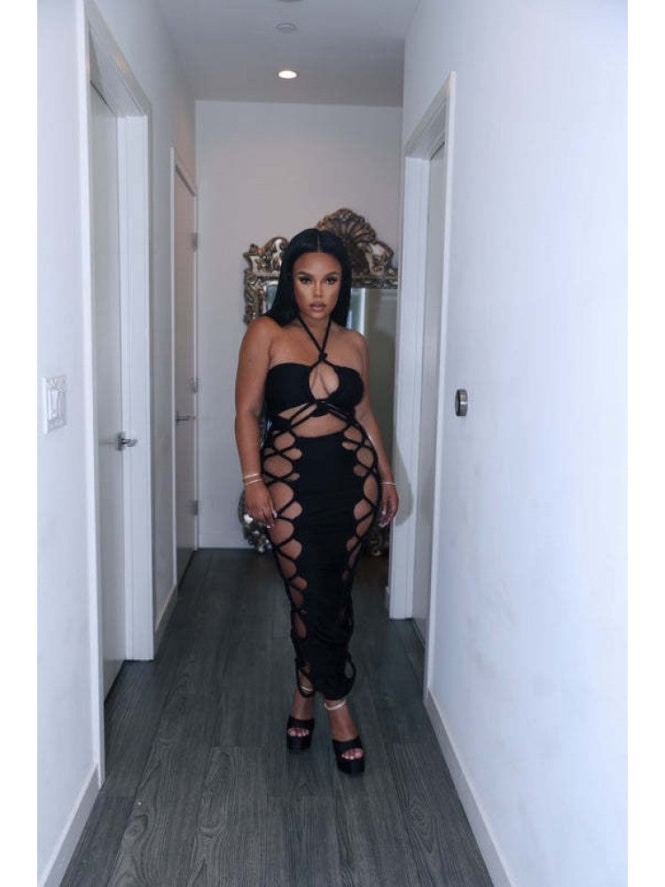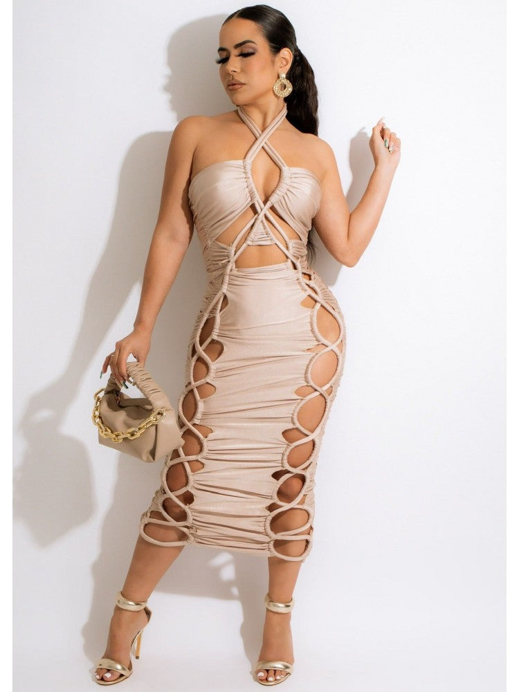 This Sexy Pure Color Hollowed Out Bandage Halter Women's Dress is a must-have! With a high-quality and textured look, and feel. This fit runs casual but, remains comfortable for you. It is made of good quality it's Very soft, and relaxed, which gives you a comfortable feeling.